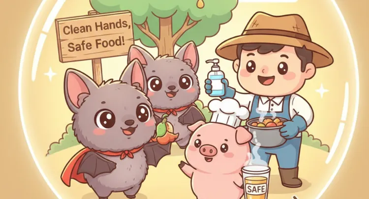 Fruit bitten by bats falls into the pig pen → Pigs consume it and become infected → The virus replicates extensively within the pigs → It is transmitted through droplets to farmers and slaughterhouse workers.